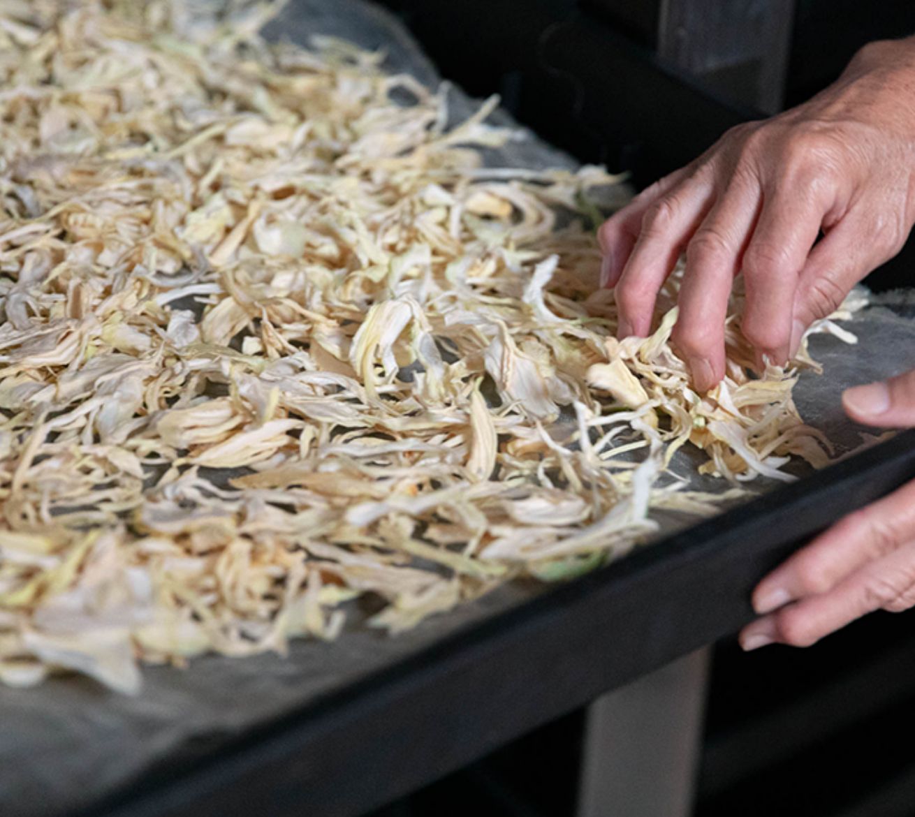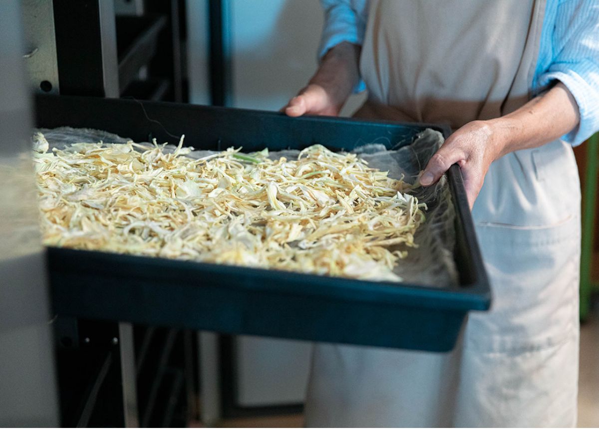 野菜ごとに最適な温度を見極め、45度ほどの低温でじっくり乾燥させることで、風味や旨味を凝縮させています。一般的なインスタント食品に入っているような乾燥野菜よりも、野菜本来の味が楽しめるのが特長です。例えば、ファイトリッチのニンジン「オランジェ」は乾燥させるとハーブのような香りがして、お茶にすると非常に好評です。このマニアックなまでの研究とこだわりが、他社には真似できない部分だと自負しています。